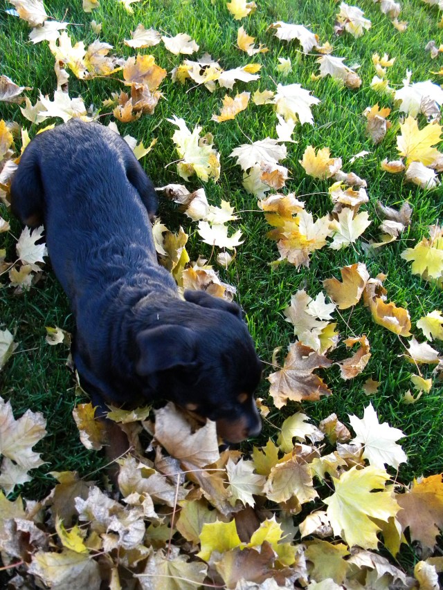 Paws out, butt up! Ha, I really don’t know what she was doing. But I like how all the leaves are surrounding her.