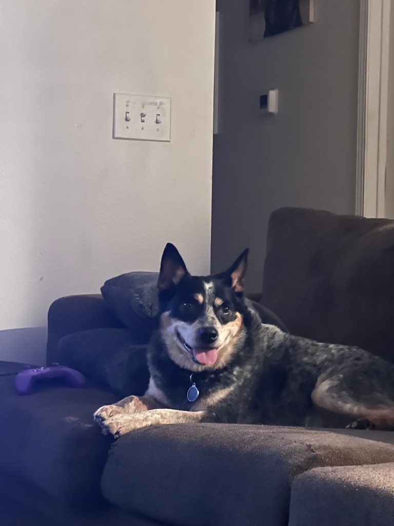 The shelter didn’t have an age estimate for us, but he is definitely full-grown and more chill than a puppy. He did have a few mild-moderate health concerns while in the shelter, but they have decreased or subsided entirely. I have a vet appointment for him this upcoming Wednesday, so hopefully she can give us an estimate and fingers crossed for all good news.